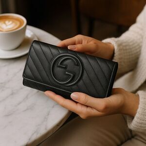 This elegant black Gucci quilted wallet is perfect for any occasion. Its sleek design and high-quality material make it a must-have accessory.