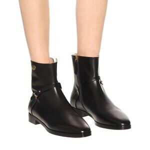 Unique Features: Black Leather Ankle Boots defined by Subtle Details. Strap across the foot finished with goldtone hardware and an enamel detail with a Double G Logo Emblem. Side Zip Closure.