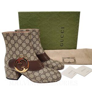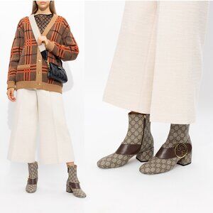 Unique Features: A combination of retro aesthetic and contemporary flair, this pair of Gucci ankle booties feature beige and ebony GG Supreme canvas, brown leather trim, oversized gold-toned interlocking G logo hardware detail, leather sole and zip closure.