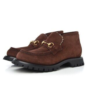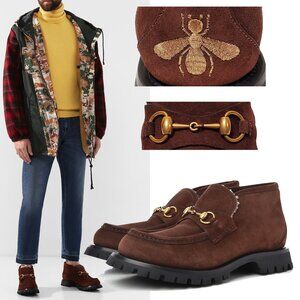 Unique Features: Men's Leather Horsebit Loafer Boots in Brown Suede with Shearling lining. Accented with the goldtone classic horsebit, the emblematic shape that is a homage to the House's heritage rooted in the equestrian world. The pair is reworked in contemporary shape with a rubber lug sole. Bee Detail on the back. Round Toe. Slip-on Style.