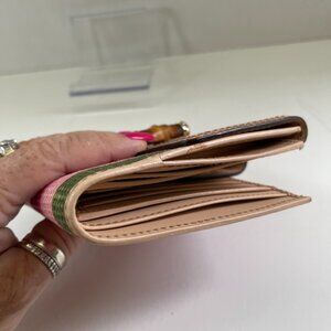 This Gucci wallet is a must-have for any fashion-forward woman. The bamboo and leather design is both stylish and durable, making it perfect for everyday use. The wallet features a striped pattern, multicolor scheme. It is a tri-fold wallet with a folding feature, making it easy to store in your purse or bag. The wallet is made in Italy and is of excellent quality. It is suitable for women of all ages and is perfect for any occasion. Add this Gucci wallet to your collection today!