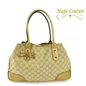 GUCCI Logo Metallic Gold Leather Tote Bag. Beige, monogram "GG" logo medium tote bag with metallic gold, leather trim/straps. Exterior: Supreme Logo Canvas & Leather Trim Straps: Leather Lining: "GG" logo canvas