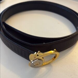 Stylish black leather belt featuring a gold buckle. Ideal for any outfit.