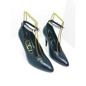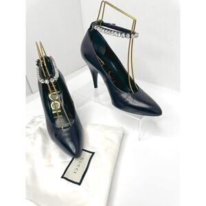 Gucci Ankle Crystal-Embellished Black Leather Pointed-Toe Pumps size 36.5