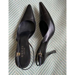Gorgeous classic Gucci pump with supple leather upper, footbed, and soles. Slip on style with delicate heel strap with adjustable gold tone metal buckle closure. Approximate 3” heel height. Made in Italy. Excellent pre worn condition. Minimal creasing across toe area, minimal wear to soles, and visible wear at left bottom heel.