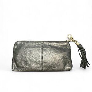 GUCCI Black Pebbled Leather Sienna Tassel Clutch Bag * Soft Pebbled leather * Leather tassel zipper pull w gold-toned horse bit accent * Measurements: 12.5" L x 2" W x 6" H * Interior Pockets: One flat pocket * Zip closure * Gold-tone hardware * Interior Lining: Fine textile lining * Made in Italy Good pre-owned condition. The outside has normal minimal wear. It was used as a makeup bag and the inside has a few makeup stains. I did not try to clean them. Please see photos for details.