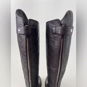 Elegant and timeless, these GUCCI knee-high riding boots feature rich dark brown leather with embossed Guccissima monogram detailing throughout. Full-length rear zipper with logo-engraved snap closure at the top. Crafted in Italy with a durable rubber sole and low stacked heel for everyday wear. Style number 296161. Made in Italy.