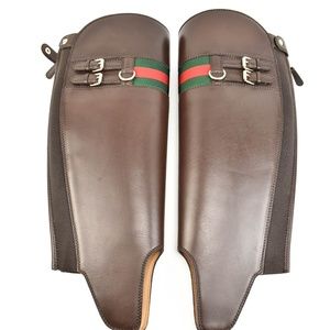 Brown, leather, tall boot shaft gaiters accented by signature, green/red "Web Stripe" trim and gold metal hardware. (Boots pictured Not included)