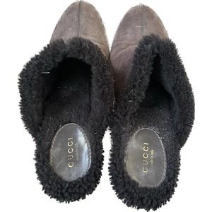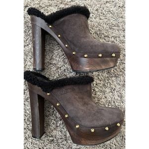 GUCCI Brown Suede Leather Fur Lined Platform Wood Stud Clogs Heels Size 40.