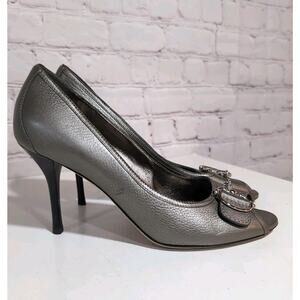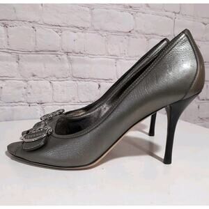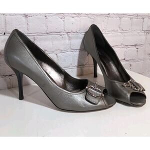 GUCCI CELLARIUS GRAY LEATHER BIT LOGO BUCKLE PEEP TOE PUMPS 40.5 ITALY Dust Bag