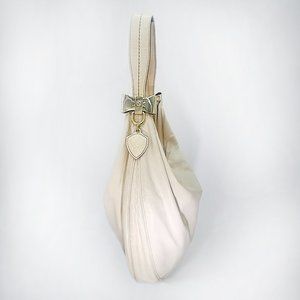 This chic classic hobo is finely crafted of grained leather in creamy white. The bag features a looping leather shoulder strap, polished gold hardware and a metal bow with a charm. The top zipper opens to a printed interior with a zipper pocket.