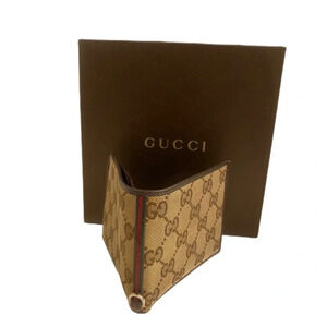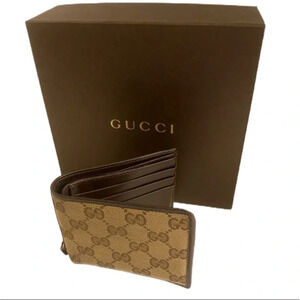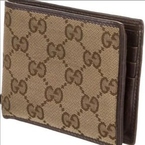 Brown and tan GG canvas Gucci wallet with silver-tone hardware, chocolate leather trim, and lining, dual bill compartments, dual slit pockets at interior, six card slots and bifold closure.