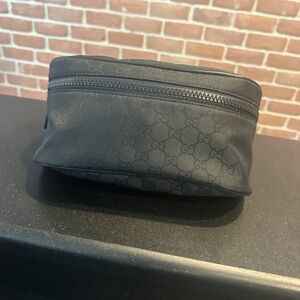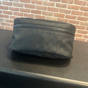 This is an authentic GUCCI Nylon Monogram Fanny Pack Belt Bag in Black. This chic belt bag is finely crafted of black Gucci GG monogram canvas and black leather trim. The bag features a canvas belt strap, rear zipper pocket, and silver hardware. The wrap around zipper opens to a black fabric interior with a patch pocket.