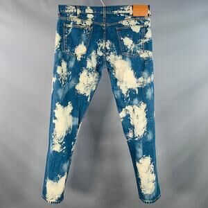 GUCCI Cruise 2017 jeans in an indigo denim twill featuring an all over white bleached design, silver tone metal studded pocket trim, and button fly closure.