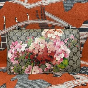 Gucci Dionysus GG Supreme Blooms shoulder bag. It features the brand's iconic GG Supreme canvas with a hand-painted floral print overlay and antique rose suede trim, all finished with antique silver-toned hardware and the signature tiger head closure. Please look at pictures as part of description and ask questions.