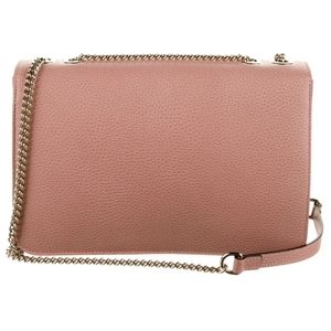 Pink grained leather Gucci Dollar shoulder bag with gold-tone hardware, convertible chain-link shoulder strap with leather shoulder guard, dual interior compartments, natural canvas interior, single zip pocket at interior wall and interlocking GG flip-lock closure at front flap. Includes dust bag.