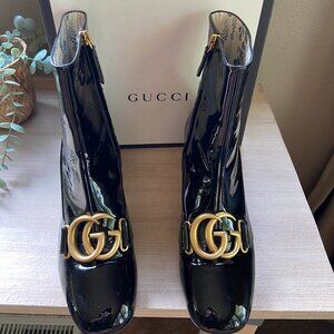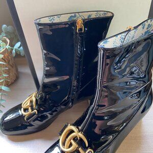 Black patent leather ankle boot with signature GG gold hardware on upper