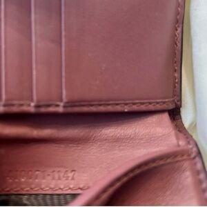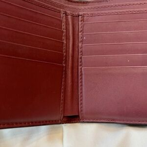 Snap closure, 10 credit card slots, 2 card slips, 2 bill slips and a coin purse with snap culture.