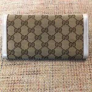GUCCI GG Full Length Canvas & Silver Gold Leather Wallet GG Clasp