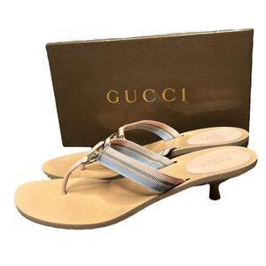 GUCCI GG Kitten Heel Beige Sandals Web Canvas Pink Blue Striped Thong Size 9.5