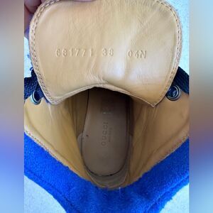 Those are authentic GUCCI GG Logo Ankle Boots Romance Casy Blue Wool & Leather Lug Sole in size EU 38 (Equivalent to US women's size 8 per Gucci website).