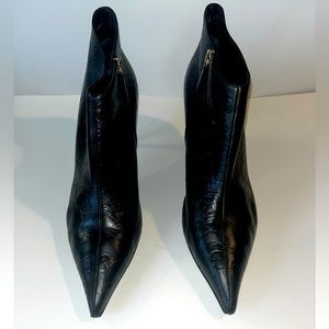 Vintage GUCCI GG monogram black leather ankle bootie with pointed toe and zipped side. Pre-owned with some signs of wear at toe (see pics). 3 inch heel. Narrow insole. Size 8.5B. Runs small. Made in Italy.