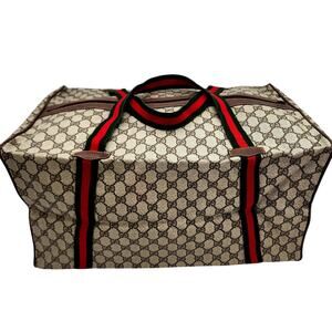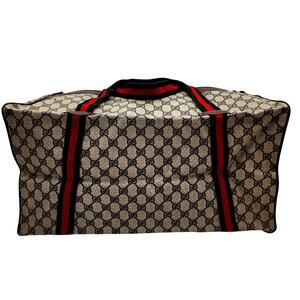 VINTAGE GUCCI DUFFLE IN GREAT CONDITION!!!GUCCI Duffle Bag GG Logo Canvas/Brown Leather Trim Folding Travel Carry on from the 80's 18" L x 12" W x 10 H. Bag is in very good condition. Minor scuffing on two corners. see pictures. Inside looks good. Handles are in very good condition. The bag is near perfect excluding the small scuff marks on one side.