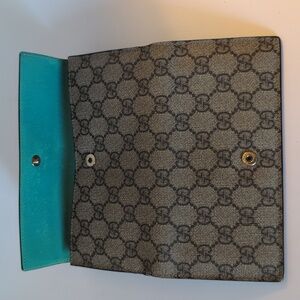This is an authentic GUCCI GG Supreme Monogram Interlocking Continental Flap Wallet. This wallet is crafted of Gucci GG monogram canvas. The wallet has a front flap coin compartment and snaps open on the other side to a teal blue leather interior with card slots and open compartments. This is a beautiful wallet for everyday, from Gucci!