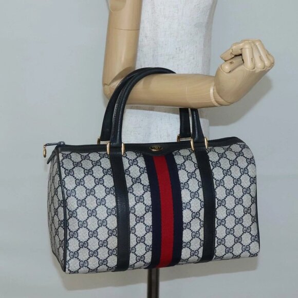 GUCCI GG Supreme Sherry Line Boston Bag PVC Navy Gold Auth ep10844