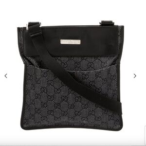 Gucci GG crossbody bag in black. Made in Italy with black monogram GG canvas. Bag measurement is approximated :W 9.4inch (23cm) x H 10inch (25cm), D 0.5 (1cm)