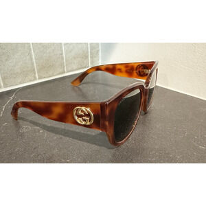 Authentic GUCCI GG0141S 002 women's sunglasses, tortoise shell frame with green lenses, logo on sides and right lense. Includes Gucci sunglasses case, satin bag, and cleaning cloth.