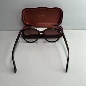 Experience timeless elegance with these Gucci black cat-eye sunglasses. Crafted with a sleek black frame and gradient smoky lenses, they offer a sophisticated touch to any ensemble. Perfect for adding a luxurious flair to your everyday look. GUCCI WOMENS CAT EYE BROWN BROWN BROWN FASHION DESIGNER EYEWEAR Temple Length: 150mm; Lens Width: 56mm; Bridge Width: 17mm | Frame Shape: Cat Eye | Frame Material: Injection | Temple Material: Injection | Non-Polarized | Glasses come with a velvet case in one of six jewel-toned shades. The case color is hand selected for each pair of glasses. Also included is a matching satin flannel pouch and microfiber cloth. | Made in Italy