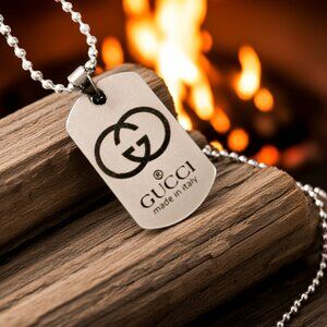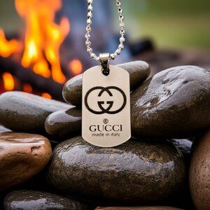 Turn heads with this authentic repurposed GUCCI pendant, originally crafted as a designer bag tag and reimagined into a bold statement accessory. Shaped like a classic military dog tag, this pendant embodies both luxury and strength, making it the perfect piece for anyone who wants to carry style with purpose.