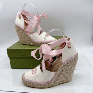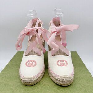 GUCCI INTERLOCKING G Platform Wedge ESPADRILLE Pink RIBBON TIE EU 40/ US 10