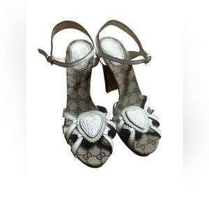 GUCCI Ivory Leather Crest Heart Ankle Strap heels