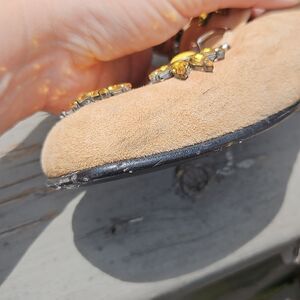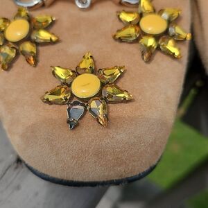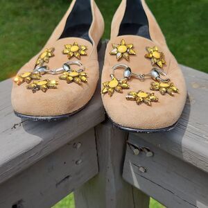 Jeweled daisies and silver-tone horsebit accent on the front. The R shoe is missing a yellow teardrop stone in the front.