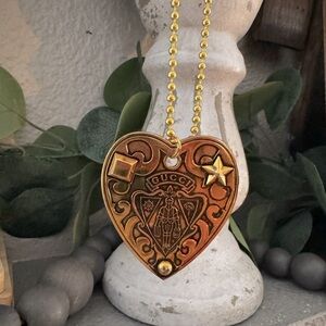 Stylish heart-shaped pendant by Gucci. Features gold finish with star and square details. Perfect for adding elegance.