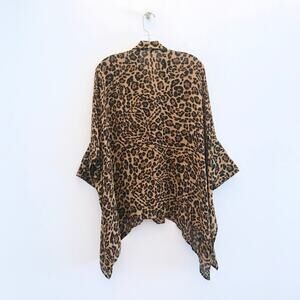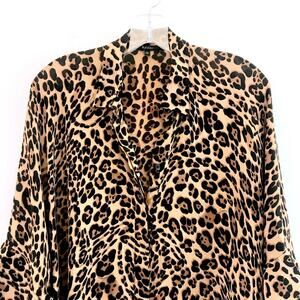 Leopard print silk georgette oversized cape blouse by Gucci. Cape sleeves. Mother-of-pearl buttons, missing cuff links. 100% Silk. Made in Italy. Preowned condition. Light signs of wear including loose threads at seams, thread pulls, and a few lines in the fabric from thread pulls (see photos).