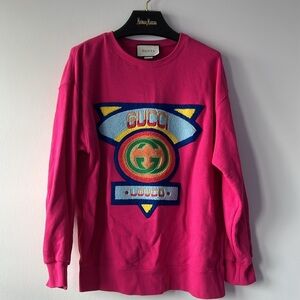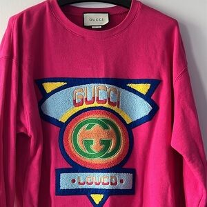 Gucci cotton jersey sweatshirtPulls onCrewneck, ribbed neckline, long sleeves, felted logo patch at front, ribbed trims100% cottonHand washModel is 6ft and wears a size mediumMade in Italy.