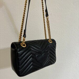 worn only 3 times! Made from soft black chevron leather with the iconic Double G and gold hardware. It fits your phone, wallet, AirPods, and lipstick. The chain strap’s adjustable, and the red interior adds a pop of color. Authentic, stylish, and practically brand new.