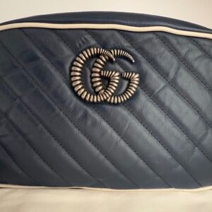Beautiful condition GUCCI !! Navy is rare in the crinkle leather camera bag!! Perfection inside beautiful cream suede Interior.