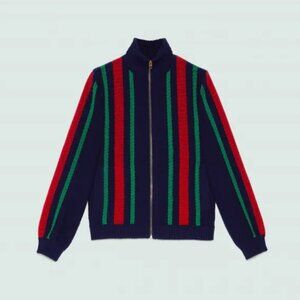 GUCCI MENS BOMBER JACKET KNIT ZIPPER CARDIGAN SWEATER WOOL WEB STRIPE sz XL