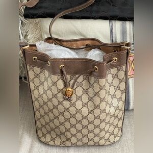 GORGEOUS GUCCI MONOGRAM BUCKET DRAWSTRING BAG✨Beautiful Vintage condition✨Gold-tone hardware✨Clean exterior✨Interior just has rubs on the leather per condition age✨Leather strap is separating in areas(see pictures) they can be glued or easily fixed a the Cobbler by new buyer✨Always 💯Authentic