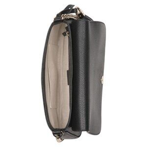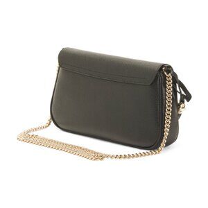 BRAND NEW Color: Black pebbled finish, chain crossbody strap, embossed brand logo design 11in W x 6.5in H 44in strap, fully extended magnetic disc closure 1 interior zip pocket, 1 interior slip pocket leather imported, made in Italy