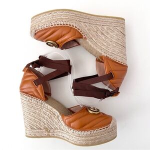 GUCCI | Marmont GG Cognac Leather Platform Espadrille Wedge Sandal US 10 EU 40