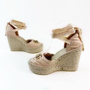 GUCCI Matelasse Leather Platform Wedge Size 38.5 Espadrille Heels Quilted Blush