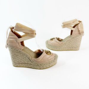 GUCCI Matelasse Leather Platform Wedge Size 38.5 US 8.5 Espadrille Heels Quilted Blush Pink Nude Beige