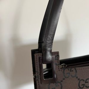 Beautiful Gucci monogram nylon brown shoulder bag. The condition is perfect. Slight scratches on the handles and slightly misshapen. Please see attached photos for reference. Looks brand new. Tonal hardware.