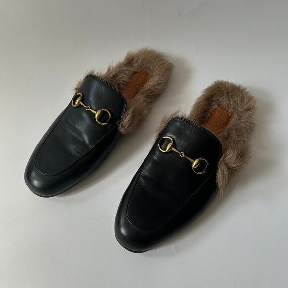 Gucci Princetown Horsebit Accent Leather Slippers. Features gold Horsebit hardware and goat fur trim.