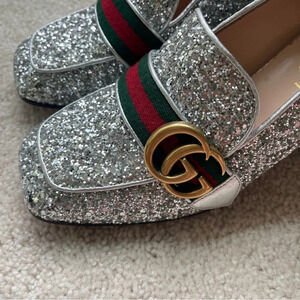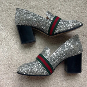 GUCCI Peyton Glitter Block Heel Loafers In Argento Silver